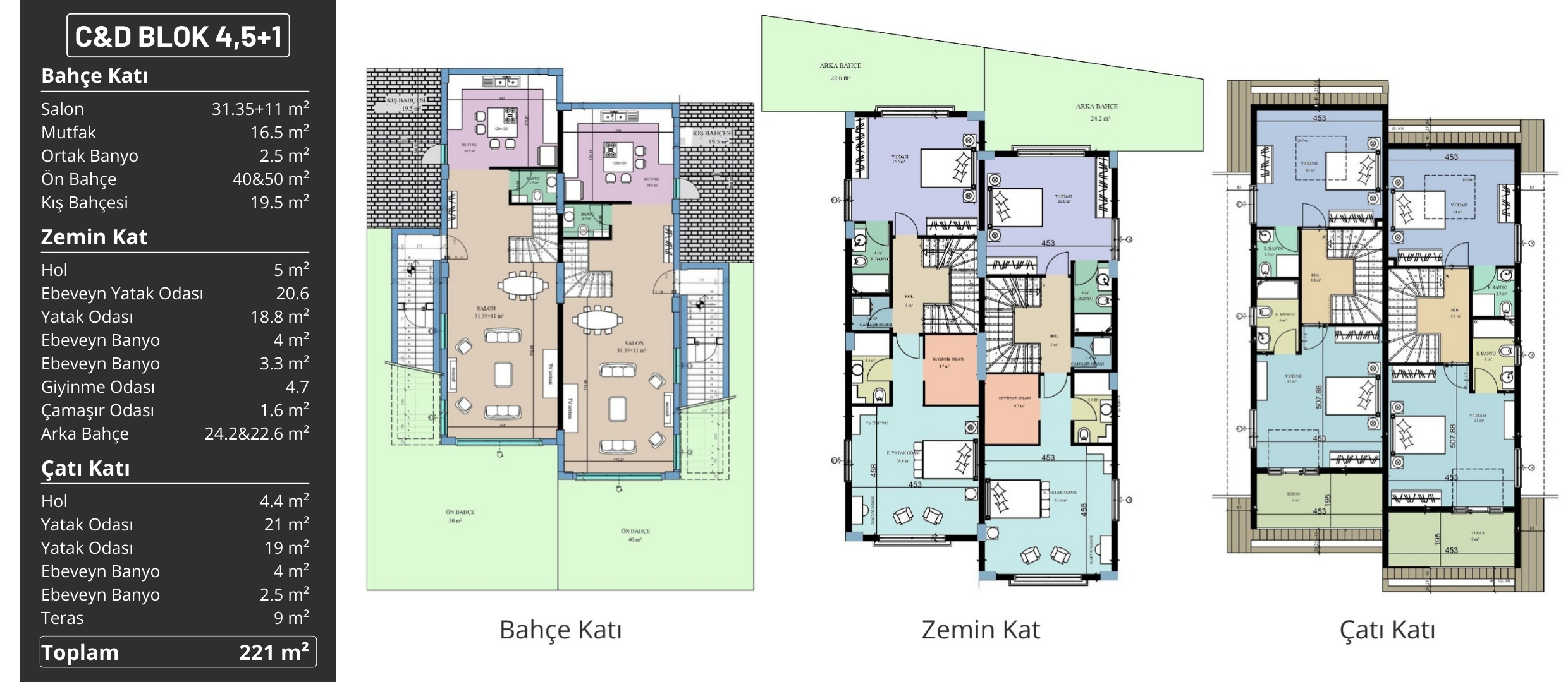 Villalarda günlük ihtiyaçlara yönelik ek fonksiyonel alanlar planlanmıştır. 0,5 oda olarak tasarlanan çamaşır alanı, geniş teras alanı ve her villaya özel bağımsız bahçe, dış mekân yaşamını evin doğal bir uzantısı hâline getirerek ferah ve keyifli bir kullanım sunar.